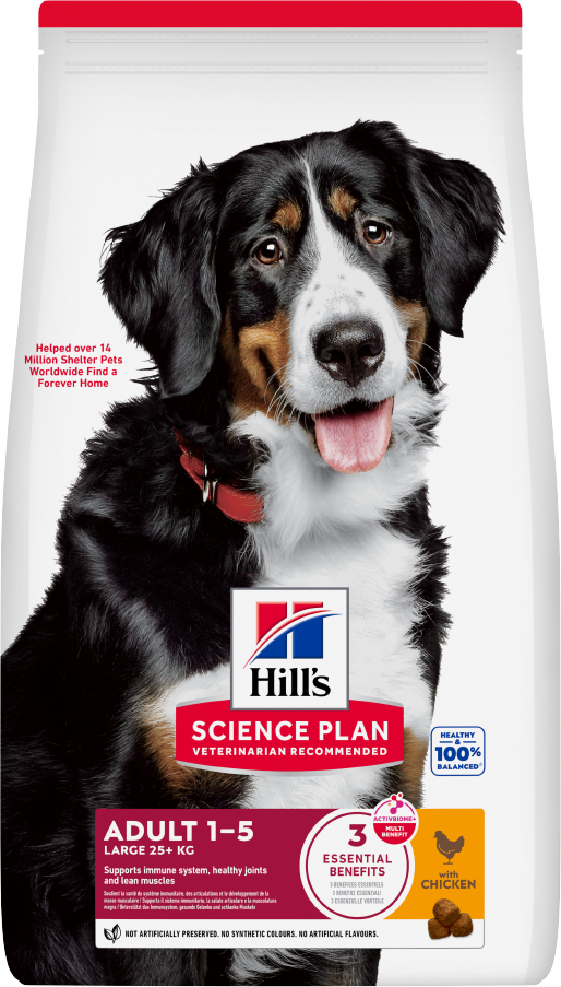 Hill’s Science Plan Adult Large Breed alimento per cani con pollo è un alimento sano ed equilibrato al 100%. È appositamente formulato con tecnologia ActivBiome + Multibenefit, una miscela di fibre prebiotiche e antiossidanti. Un’alimentazione basata sulla scienza per favorire una vita lunga e sana.