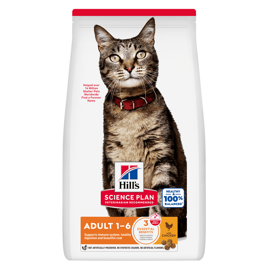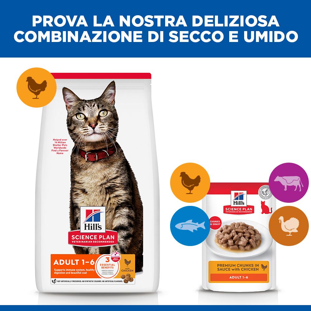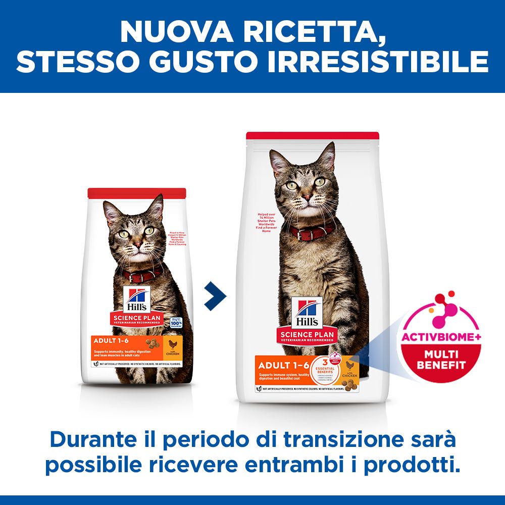 Hill’s Science Plan Adult alimento secco per gatti con pollo è un alimento sano e bilanciato al 100%. Contiene la tecnologia ActivBiome+ Multi-Benefit, una miscela di fibre prebiotiche e antiossidanti, che favorisce la salute dell’apparato digerente e il benessere generale del tuo gatto nel corso della sua vita. Un’alimentazione basata sulla scienza per favorire una vita lunga e sana. Vantaggi principali: