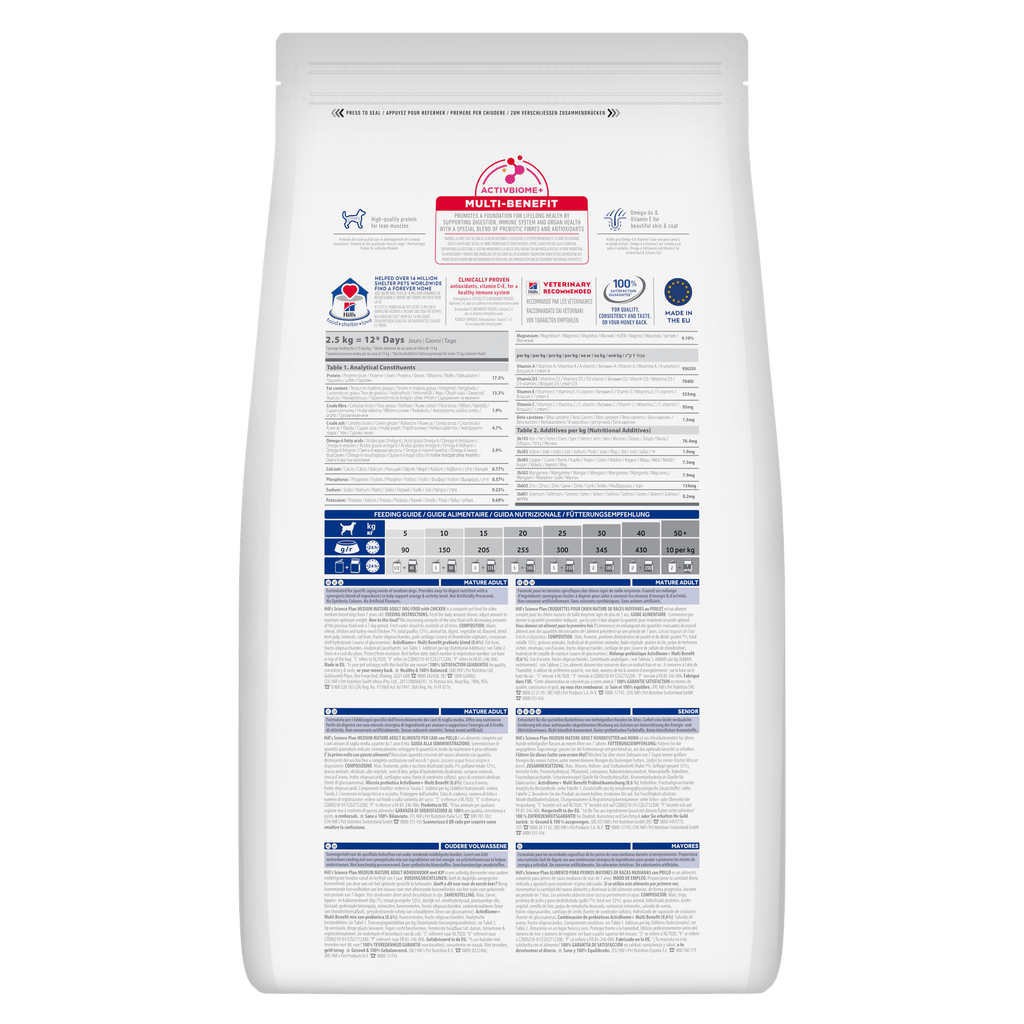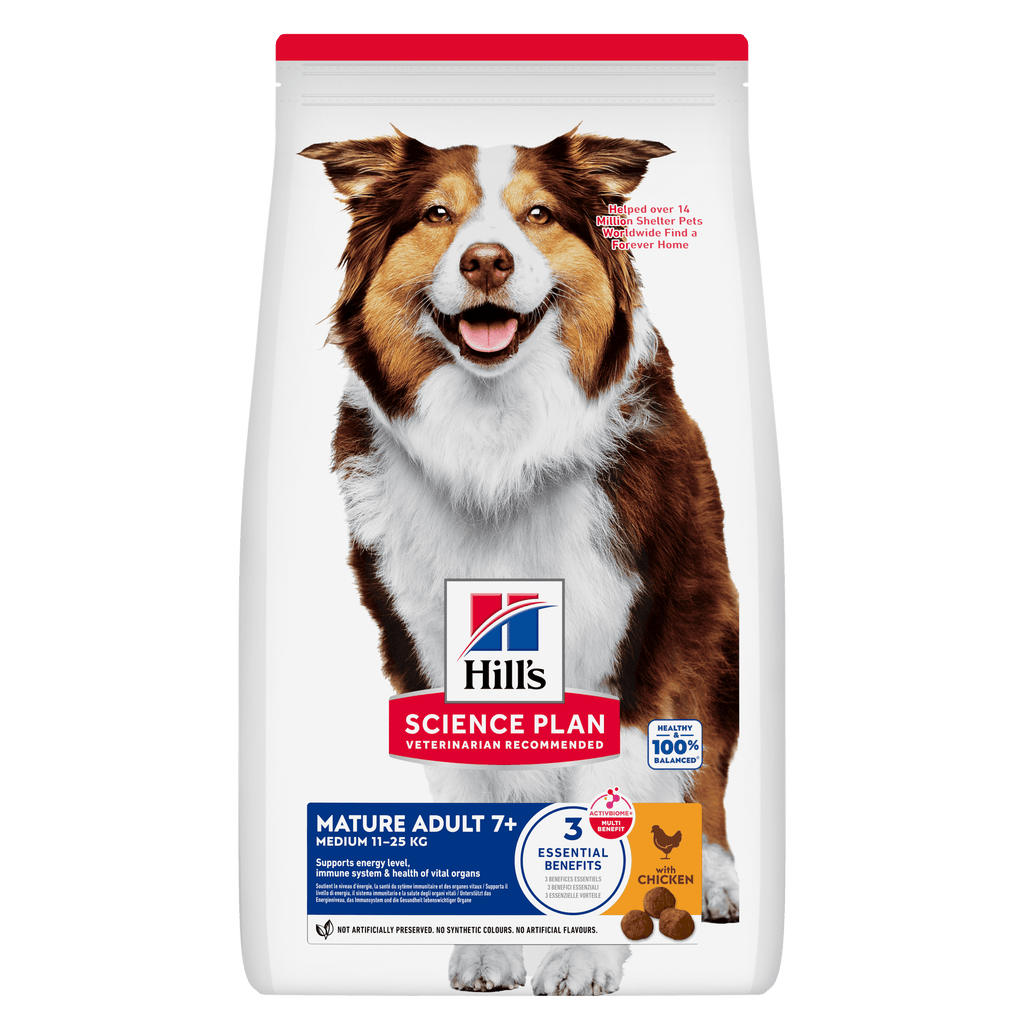 Hill’s Science Plan Mature Adult Medium Breed alimento per cani con pollo è un alimento sano ed equilibrato al 100%. È appositamente formulato con tecnologia ActivBiome + Multibenefit, una miscela di fibre prebiotiche e antiossidanti. Un’alimentazione basata sulla scienza per favorire una vita lunga e sana. Vantaggi principali: